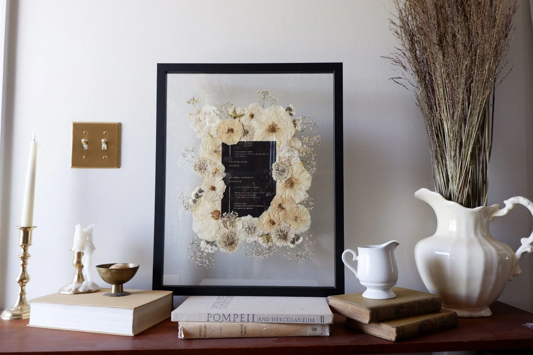 Transform your wedding flowers into a cherished part of your daily decor. Displayed in a timeless white frame, available in various sizes and shapes, your blooms will be beautifully preserved on archival white paper.